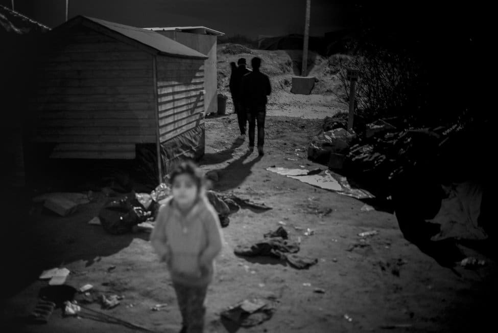 A young child drifts alone at night through the muddy, makeshift streets of The Jungle.