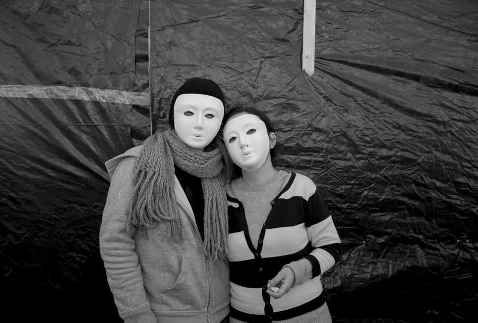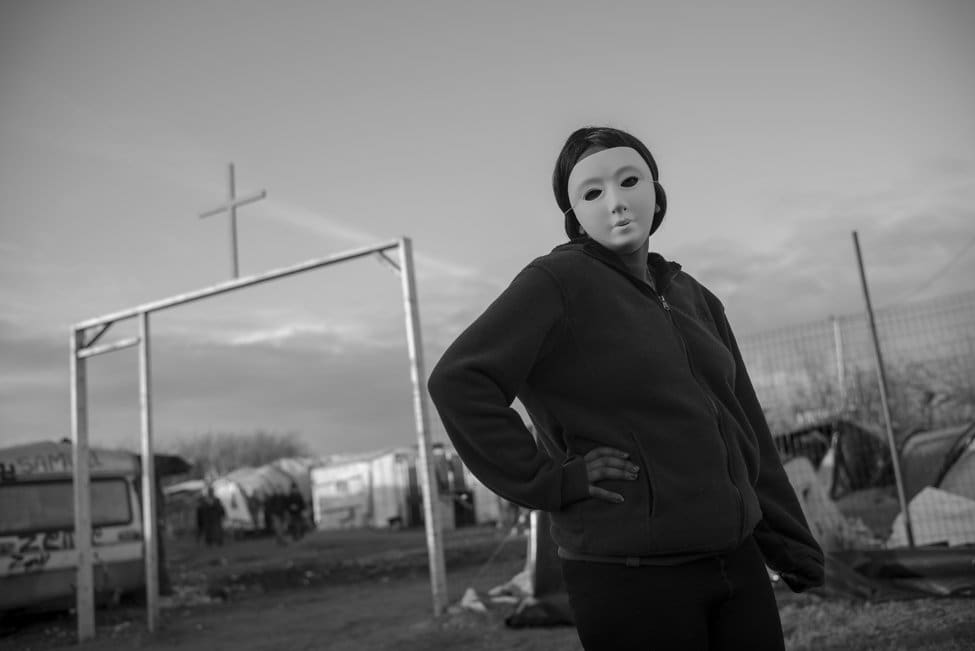 Two young Kurdish women wear masks to protect their identity from publicity. They live in The Jungle camp on the border of Calais port and are outnumbered by a 90 percent male population.